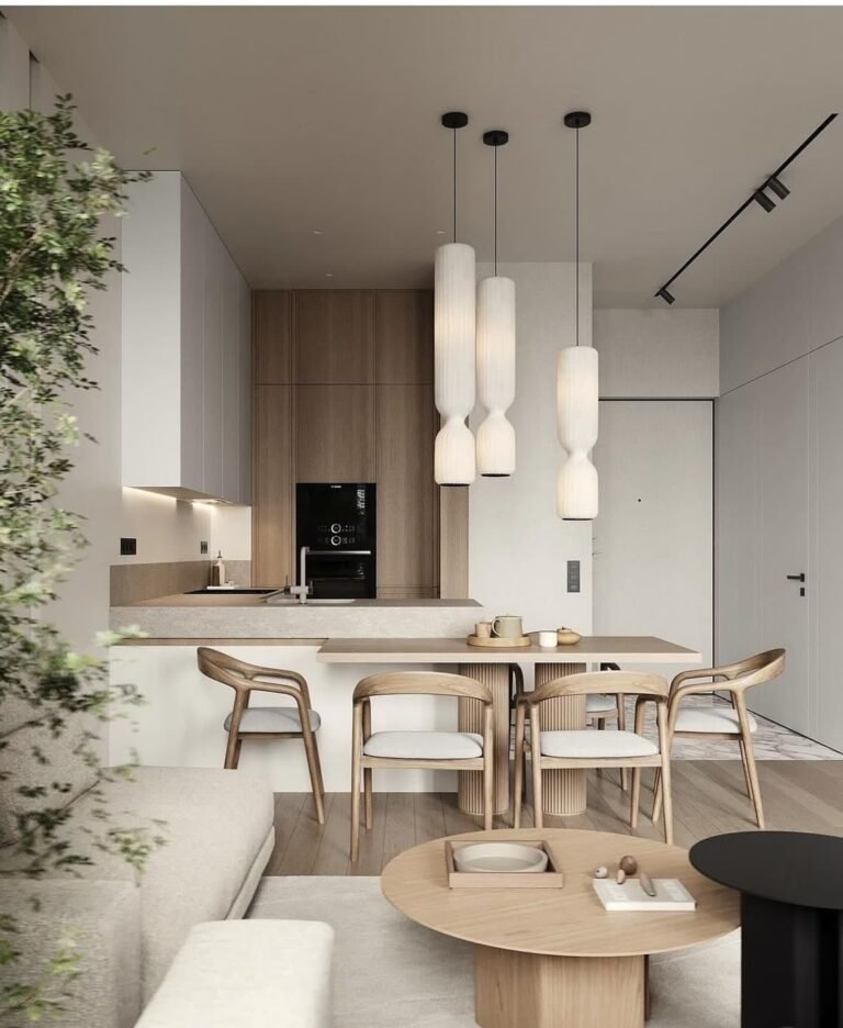 Decoración equilibrada: plantas, lámparas colgantes y taburetes modernos aportan calidez sin sobrecargar.
