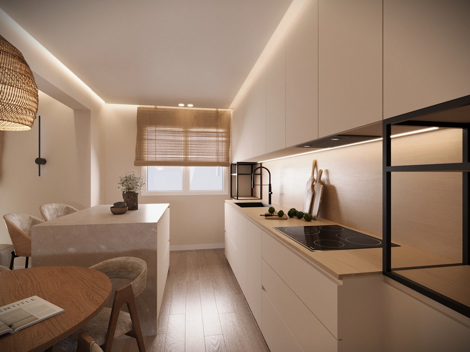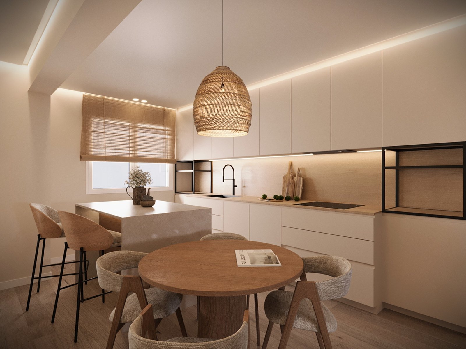 En este proyecto buscamos crear un espacio tranquilo, funcional y equilibrado, donde todo fluye con naturalidad. La luz, los materiales orgánicos y las formas simples son los verdaderos protagonistas. El diseño se desarrolla en un único ambiente que une cocina, comedor y salón, favoreciendo la conexión visual y el movimiento libre entre las zonas. Cada detalle está pensado para transmitir armonía, calma y bienestar, logrando un lugar acogedor y lleno de equilibrio.